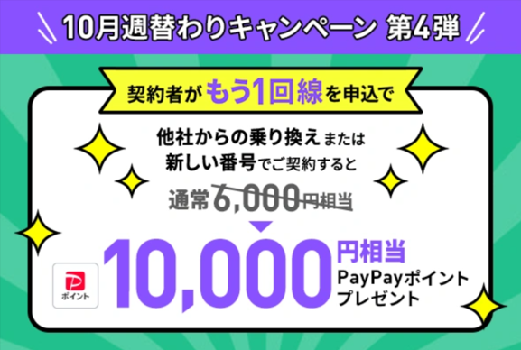 ラインモ契約者が、当キャンペーンの開催期間中に「他社から乗り換え」もしくは「新規契約」で、もう1回線追加申し込みをすると10,000円相当のPayPayポイントをプレゼント!