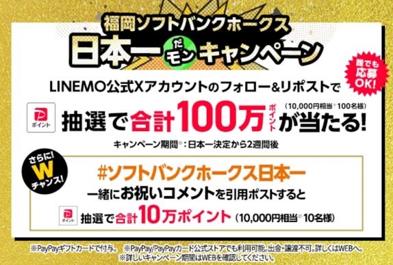 さらに「#ソフトバンクホークス日本一」と一緒に、お祝いのコメントを引用ポストすると、抽選で10名に10,000円相当のPayPayポイントをプレゼント!