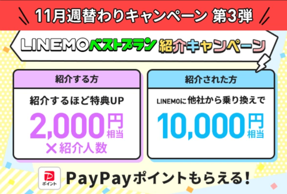 LINEMOを紹介すると、最大12,000円相当(1回線あたり2,000円相当×6回線)のPayPayポイントをプレゼント!