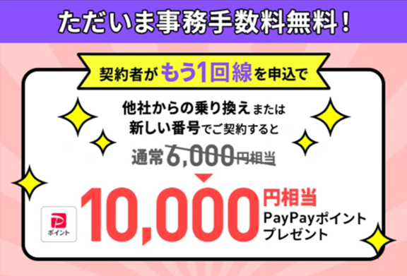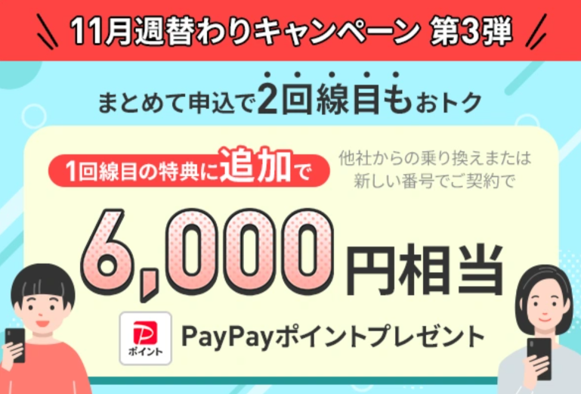 ラインモ契約者が、当キャンペーンの開催期間中に「他社から乗り換え」もしくは「新規契約」で、もう1回線追加申し込みをすると6,000円相当のPayPayポイントをプレゼント!