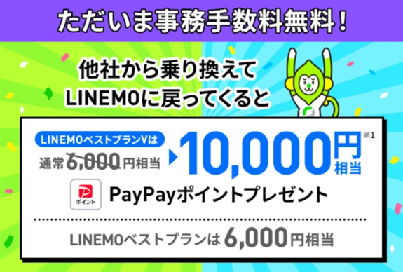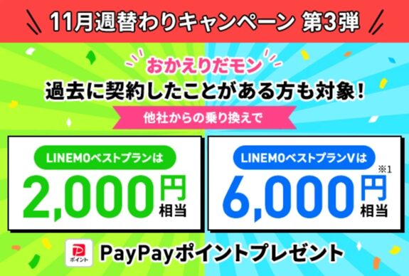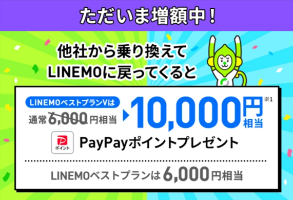 LINEMO公式サイトにある対象の申し込みページを経由して、他社から乗り換え(MNP)をすると「LINEMOベストプランV」は6,000円相当、「LINEMOベストプラン」は2,000円相当のPayPayポイントをプレゼント!
