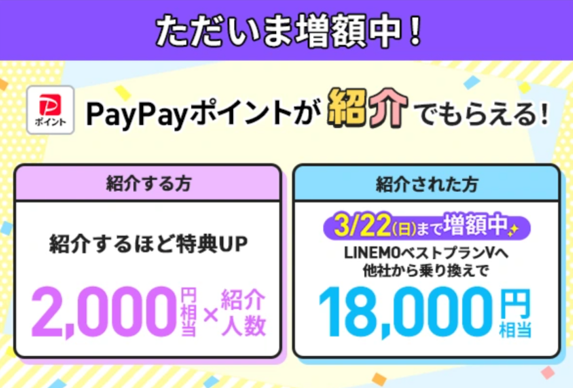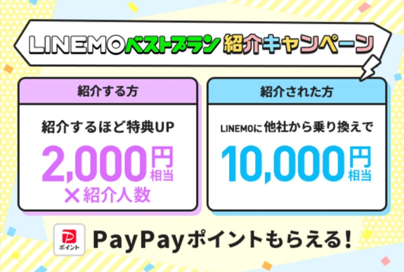 LINEMOを紹介すると、1回線あたり2,000円相当×紹介人数分のPayPayポイントをプレゼント!