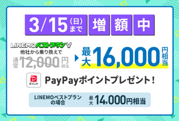 キャンペーン期間中に、他社から乗り換え(MNP)または、新しい電話番号で『LINEMOベストプランV』に契約をすると最大16,000円相当、『LINEMOベストプラン』の契約は最大14,000円相当のPayPayポイントをプレゼント!