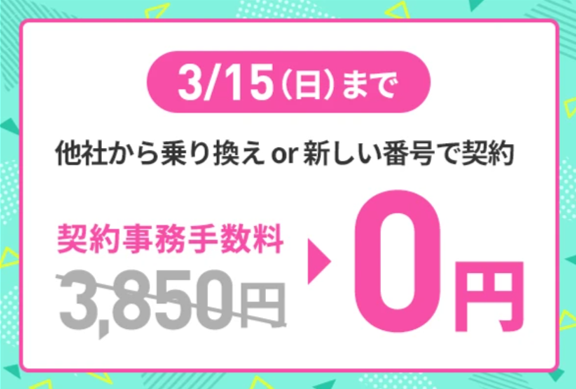 キャンペーン期間中に、新しい番号または他社からの乗り換え(MNP)で契約をすると、契約事務手数料3,850円を割引!