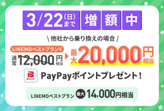 キャンペーン期間中に、他社から乗り換え(MNP)または、新しい電話番号で『LINEMOベストプランV』に契約をすると最大20,000円相当、『LINEMOベストプラン』の契約は最大14,000円相当のPayPayポイントをプレゼント!