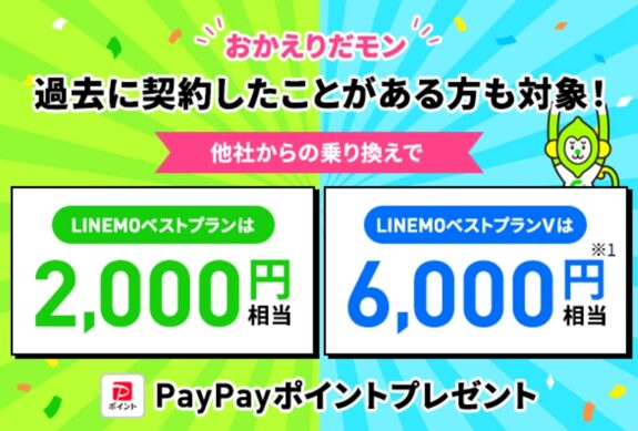 LINEMO公式サイトにある対象の申し込みページを経由して、他社から乗り換え(MNP)をすると「LINEMOベストプランV」は6,000円相当、「LINEMOベストプラン」は2,000円相当のPayPayポイントをプレゼント!
