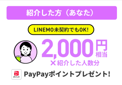 LINEMOを紹介すると、1回線あたり2,000円相当×紹介人数分のPayPayポイントをプレゼント!