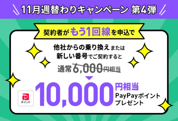 ラインモ契約者が、当キャンペーンの開催期間中に「他社から乗り換え」もしくは「新規契約」で、もう1回線追加申し込みをすると6,000円相当のPayPayポイントをプレゼント!