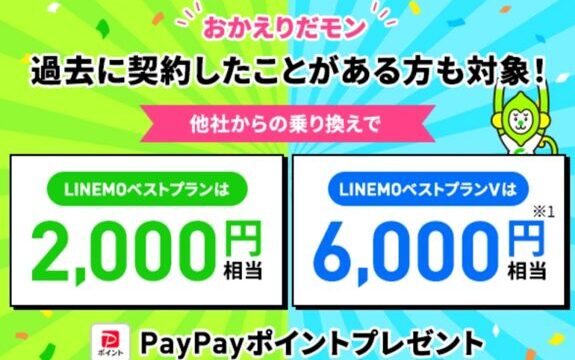今回のラインモのキャンペーンは年末年始ということもあり、いつものキャンペーンに比べてPayPayポイントの特典金額が多くなっています。キャンペーンの適用条件も他社から乗り換え(MNP)でスマホプランを選ぶだけなのでメリットは大きいと思います。