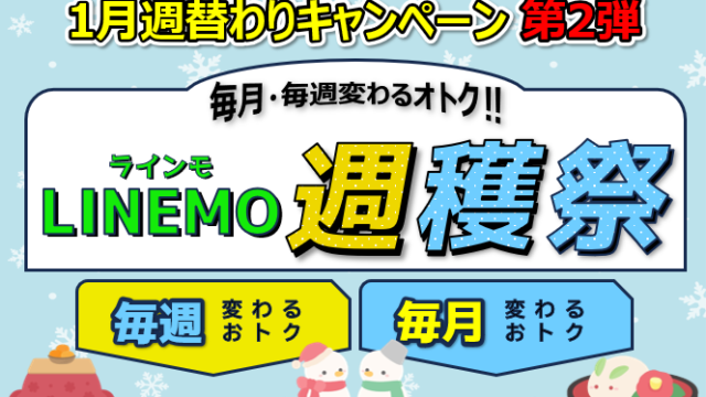 キャンペーン情報 【1月週替わりキャンペーン 第1弾】LINEMO週穫祭キャンペーンまとめ 2026年1月13日 blog ラインモが毎月週替わりで開催している『週穫祭キャンペーン』の最新情報をご紹介いたします。 今週は、今年最初の週替わりキャンペーン第1弾 …